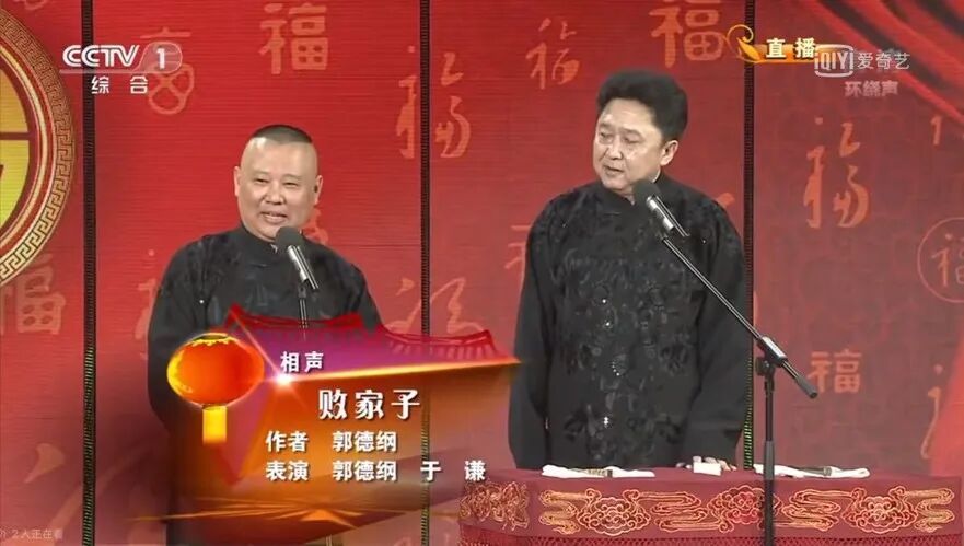 此前一年,2013年,他的师父郭德纲第一次,也是至今唯一一次登上春晚舞台,和于谦合作相声《败家子》。作品以环保为话题,讽刺铺张浪费,也让全国观众记住了于谦的三大爱好,“抽烟、喝酒、烫头”。